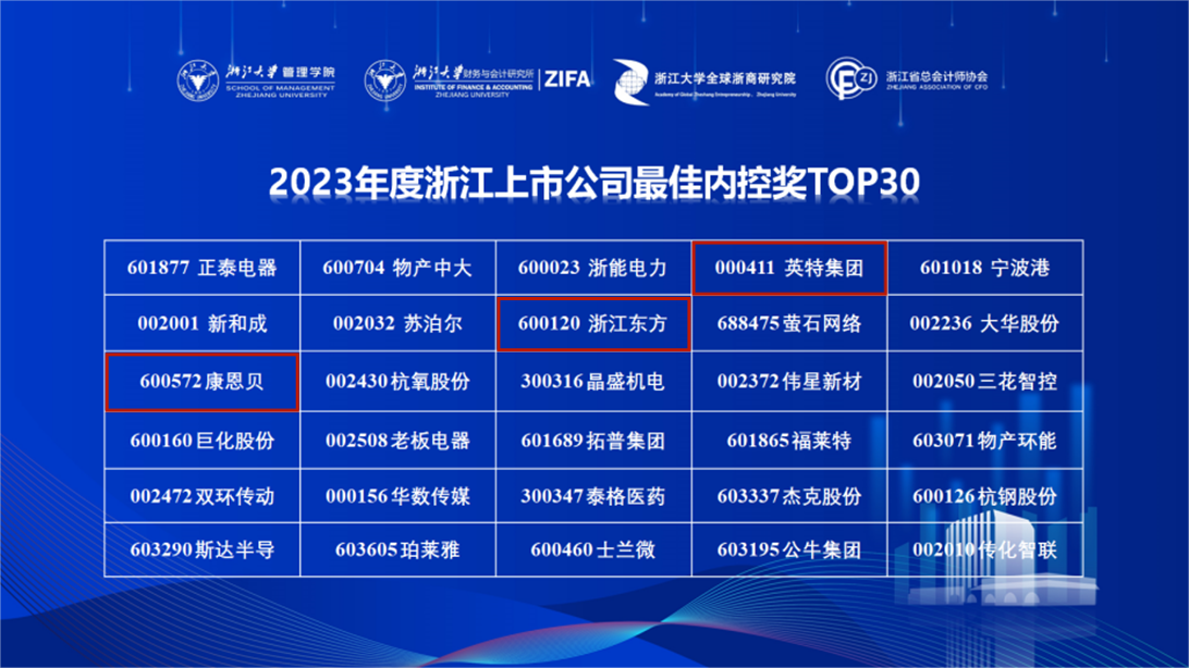 近日,由浙江大學(xué)管理學(xué)院、浙江大學(xué)財(cái)務(wù)與會(huì)計(jì)研究所、浙江大學(xué)全球浙商研究院和浙江省總會(huì)計(jì)師協(xié)會(huì)聯(lián)合主辦的第七屆上市公司高質(zhì)量發(fā)展論壇暨2023年浙江上市公司內(nèi)部控制指數(shù)發(fā)布會(huì)順利舉行。會(huì)議發(fā)布了《2023浙江上市公司內(nèi)部控制指數(shù)報(bào)告》,并揭曉了2023浙江上市公司最佳內(nèi)控三十強(qiáng)榜單。集團(tuán)下屬英特集團(tuán)、浙江東方、康恩貝上榜,分別榮登TOP4、TOP8、TOP11。